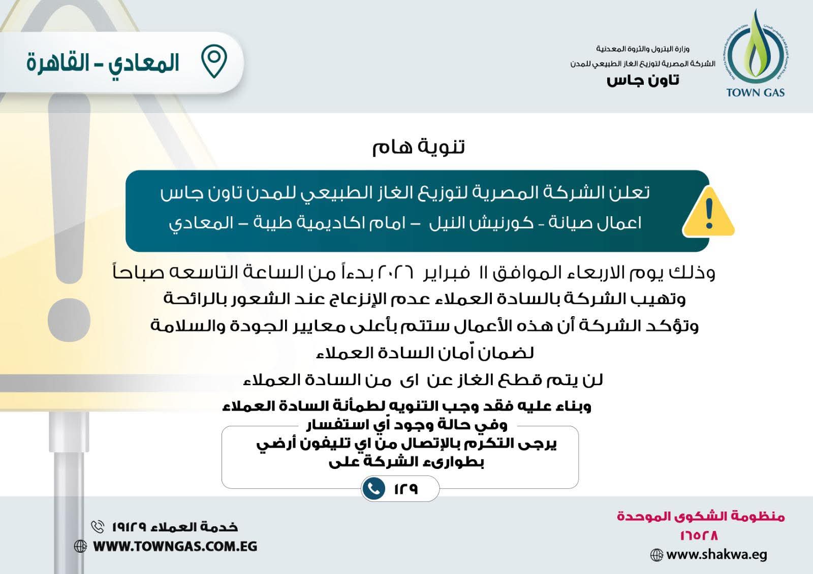 أعلنت الطبيعي للمدن "تاون جاس" إحدى شركات قطاع البترول، عبر صفحتها على موقع التواصل الاجتماعي "فيس بوك"، عن أعمال صيانة كورنيش النيل أمام اكاديمية طيبة المعادى ، وذلك يوم الأربعاء بدءا من الساعة التاسعة صباحا.