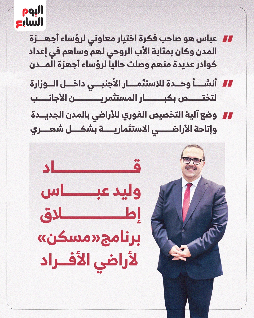 وليد عباس اول معاون لوزير الإسكان فى حقيبة رئيس الوزراء الحالي وقت توليه حقيبة الإسكان