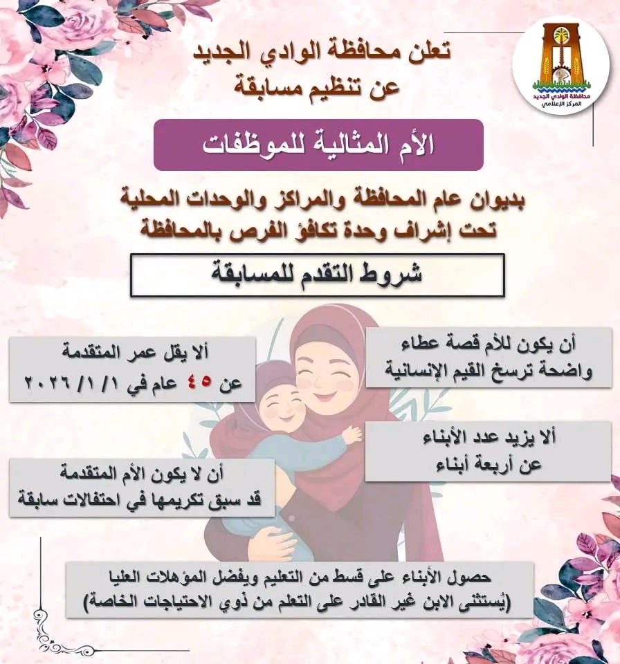 أعلنت محافظة الوادى الجديد عن تنظيم مسابقة الأم المثالية للموظفات بديوان عام المحافظة والمراكز والوحدات المحلية.