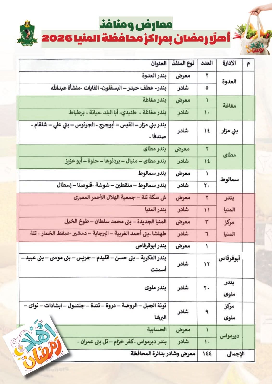 ففى مركز العدوة شمال المحافظة تم توفير معرضين أهلا رمضان و5 شوادر بقرية عطف حيدر والبسقلون والقيات ومنشية عبدالله، وفى مركز مغاغة تنفيذ معرض واحد و10 شوادر بمختلف القرى بينما فى مركز بنى مزار 14 شادر بينهم شادر ببندر بنى مزار، اما فى مركز مطاى تم تنفيذ 2 معرض بالبندر بالاضافة إلى 14 شادر بينما فى مركز سمالوط تم تنفيذ معرض واحد و14 شخص، اما فى بندر المنيا تم تنفيذ 2 معرض و11 شادر فى القرى، وفى مركز المنيا تنفيذ 3 معرض و6 شوادر، وفى مركز ابوقرقاص تم تنفيذ معرض واحد و12 شادر، اما بندر ملوى 20 شادر تم تنفيذهم وفى مركز ملوى تنفيذ معرض واحد و10 شوادر.