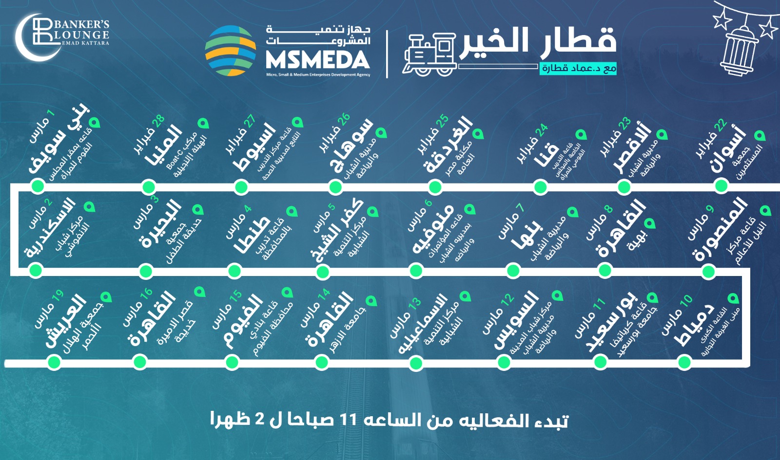 وأشار قطارة إلي أن (مبادرة قطار الخير مع جهاز تنمية المشروعات) تقام تحت رعاية العديد من البنوك الكبرى خلال شهر رمضان بـ22 محافظة تبدأ بمحافظة أسوان يوم الاحد القادم وتستمر في عقد لقاءاتها علي مدار الشهر الكريم من الساعة 11 صباحا.