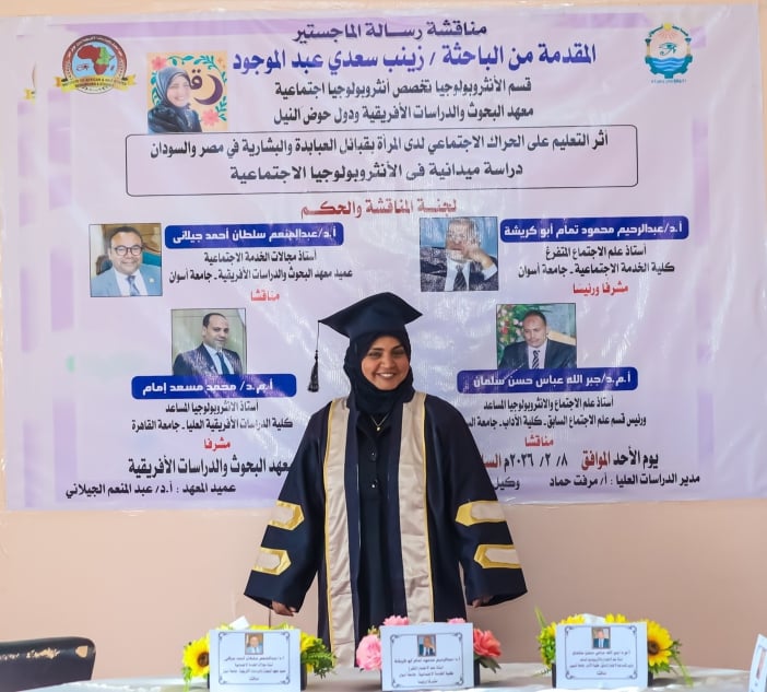 شهدت جامعة أسوان، حصول الباحثة زينب سعدى عبد الموجود، على بتقدير امتياز، من ودول حوض النيل، بقسم الأنثروبولوجيا – تخصص أنثروبولوجيا اجتماعية، بعد مناقشة رسالتها العلمية وسط إشادة من لجنة الحكم والمناقشة بالمستوى العلمى للدراسة وأهميتها المجتمعية.