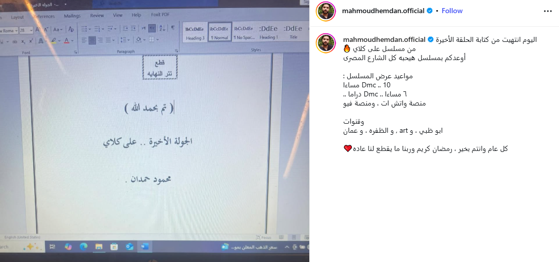 وقال حمدان، عبر حسابه على انستجرام: "اليوم انتهيت من كتابة الحلقة الأخيرة من ، أوعدكم بمسلسل هيحبه كل الشارع المصري.. كل عام وانتم بخير ورمضان كريم وربنا ما يقطع لنا عادة".