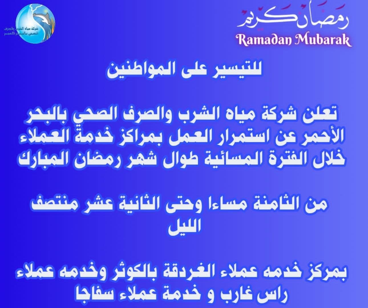 أعلنت شركة مياه الشرب و، عن استمرار العمل بمراكز خدمة العملاء خلال الفترة المسائية طوال شهر رمضان المبارك، وذلك في إطار التيسير على المواطنين وتسهيل حصولهم على الخدمات.