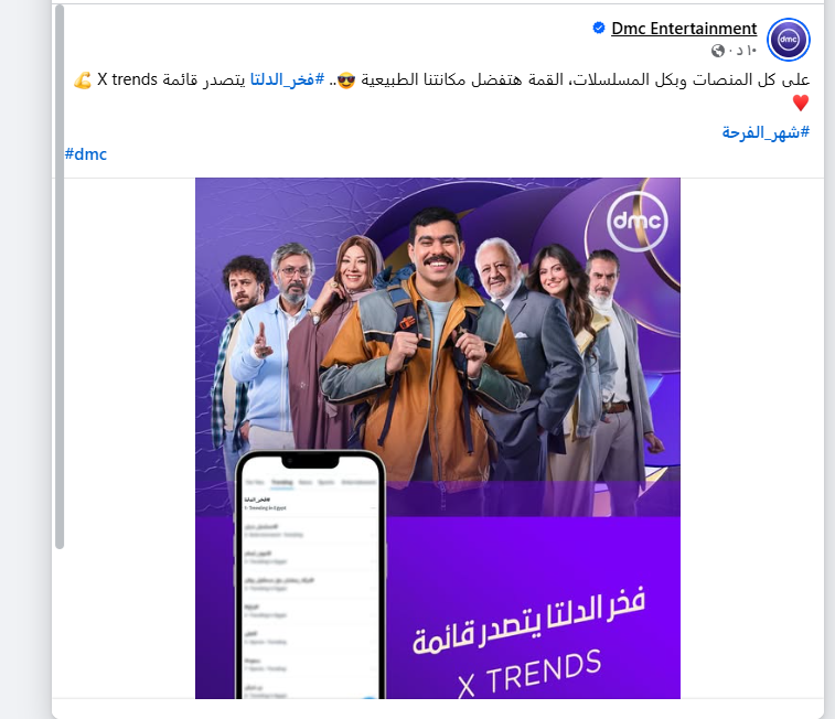 أعلنت عن تصدر مسلسل فخر الدلتا قائمة تريندات موقع x وذلك بعدما شهدت الحلقة السادسة من مسلسل "فخر الدلتا"، المعروض على قناة DMC ومنصة Watch it الرقمية، مشاركة فخر، الذي يجسد شخصيته الفنان أحمد رمزي، في أحد الإعلانات عن "السمنة الفلاحي"، قبل أن يكتشف أن الهدف من المشاركة هو السخرية منه.