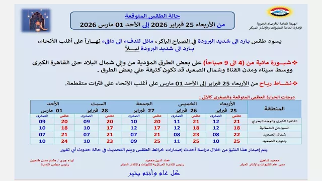 تتوقع، أن يشهد اليوم الثلاثاء 24 فبراير 2026 سادس أيام شهر رمضان المبارك، طقسا باردا إلى شديد البرودة فى الصباح الباكر، مائل للدفء إلى دافئ نهارا على أغلب الأنحاء، بارد إلى شديد البرودة ليلا على أغلب الأنحاء.
